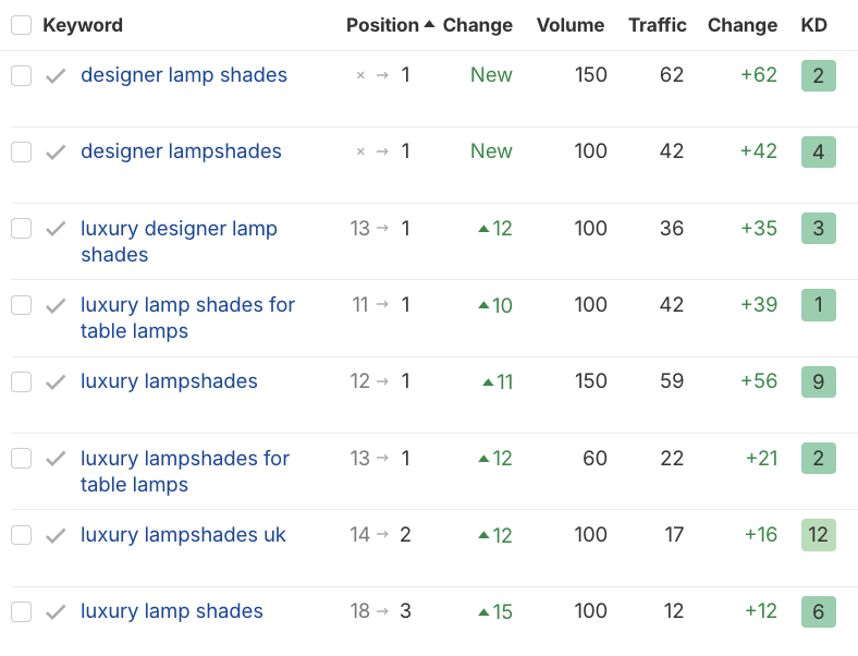 Every ranking gain is tied to product-related queries like designer lamp shades and luxury lamp shades for table lamps - all of which now drive consistent sales from new audiences.